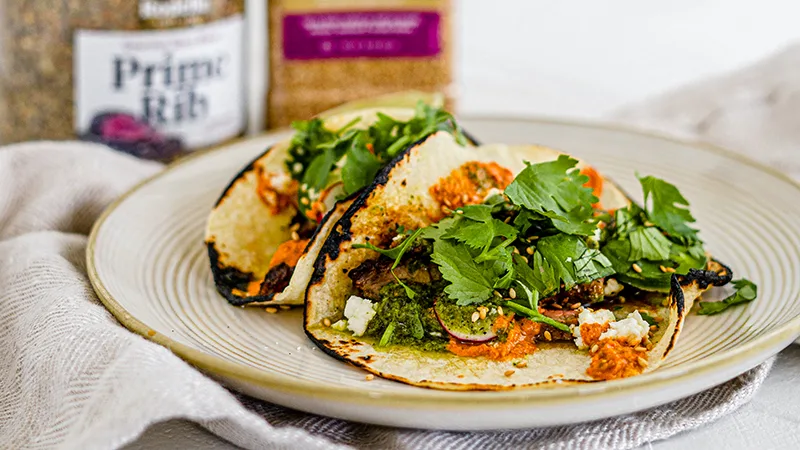 Taco night just got better! This recipe features Rodelle’s Prime Rib Seasoning blend with chipotle in adobo to make your steak taco experience NEXT level! We won’t stop there, every taco needs salsa. Included are both an herb forward salsa verde and a toasted pepita salsa rojo. Try them separately or mixed together, there is no wrong way to eat these!