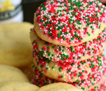These Easy Christmas Cookies from Wonky Wonderful begin with a basic chocolate chip cookie base then are coated with red, green and white nonpareil sprinkles. A fun festive holiday cookie that everyone will love!