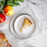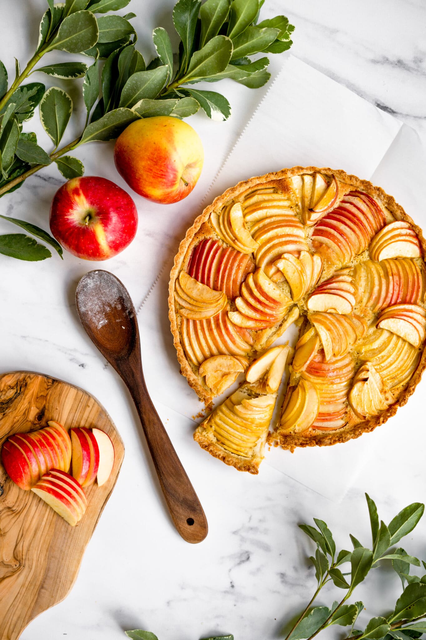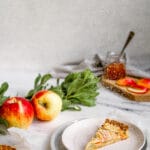 A simple, classic dessert with a deliciously buttery, flaky pie crust inspired by a French countryside recipe. Butter marbled pie crust dough is filled with homemade frangipane (almond paste) and topped with freshly sliced Pink Lady apples. Before baking, the entire tart gets a light coating of sugar which is the secret to the tart’s subtle sweetness. The final baked tart is glazed with warm apricot glaze and then topped with a light dusting of powdered sugar.