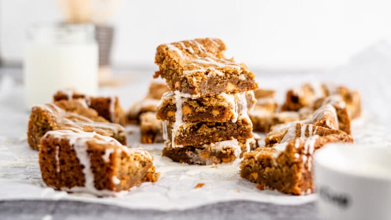 - Combine the ingredients for the glaze in a bowl. Then drizzle the glaze over the blondies. Cut the blondies into 16 squares.