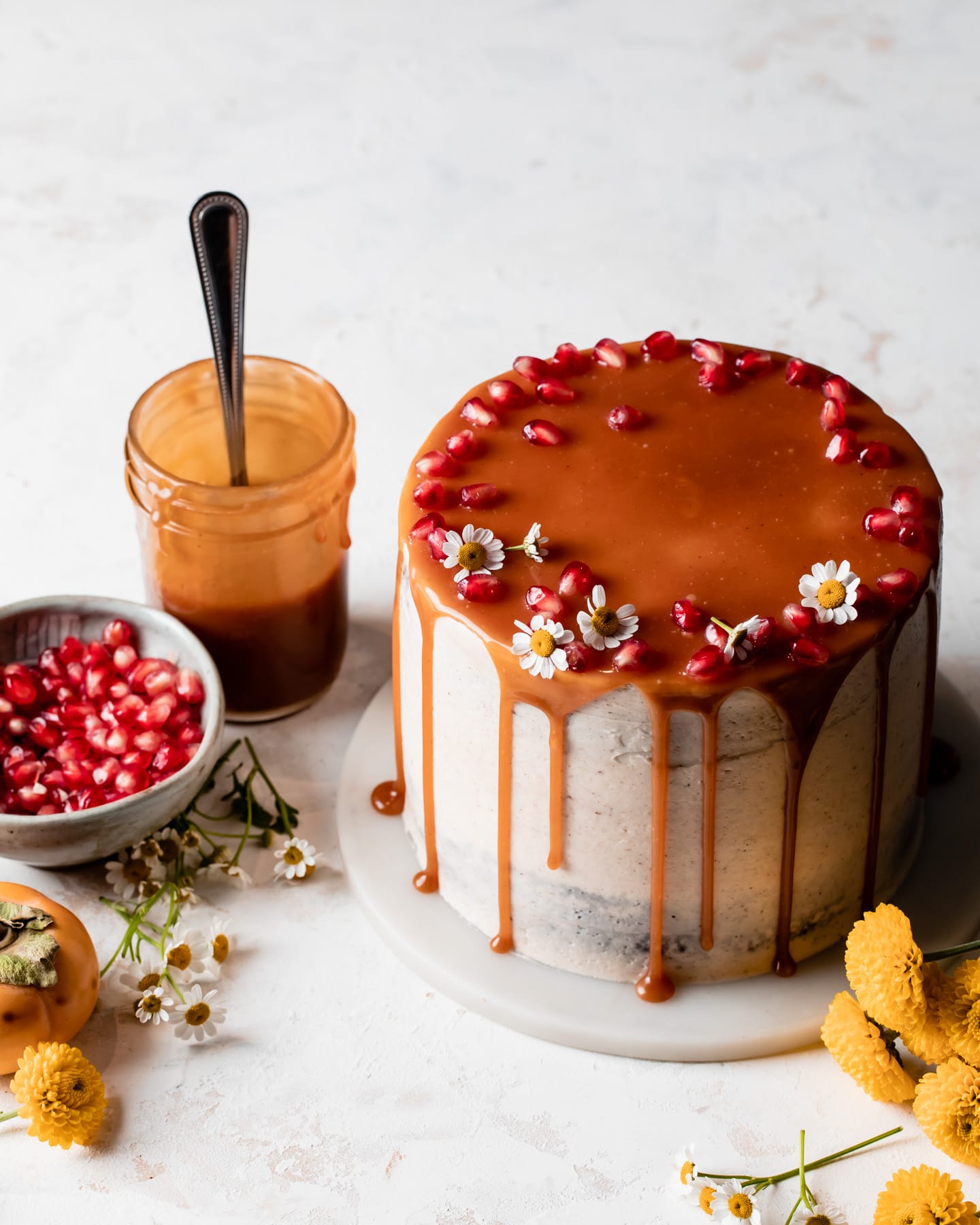 - Use the remaining buttercream to frost the cake in a thin layer of icing. Pour the cooled caramel over the top of the cake and decorate as desired.