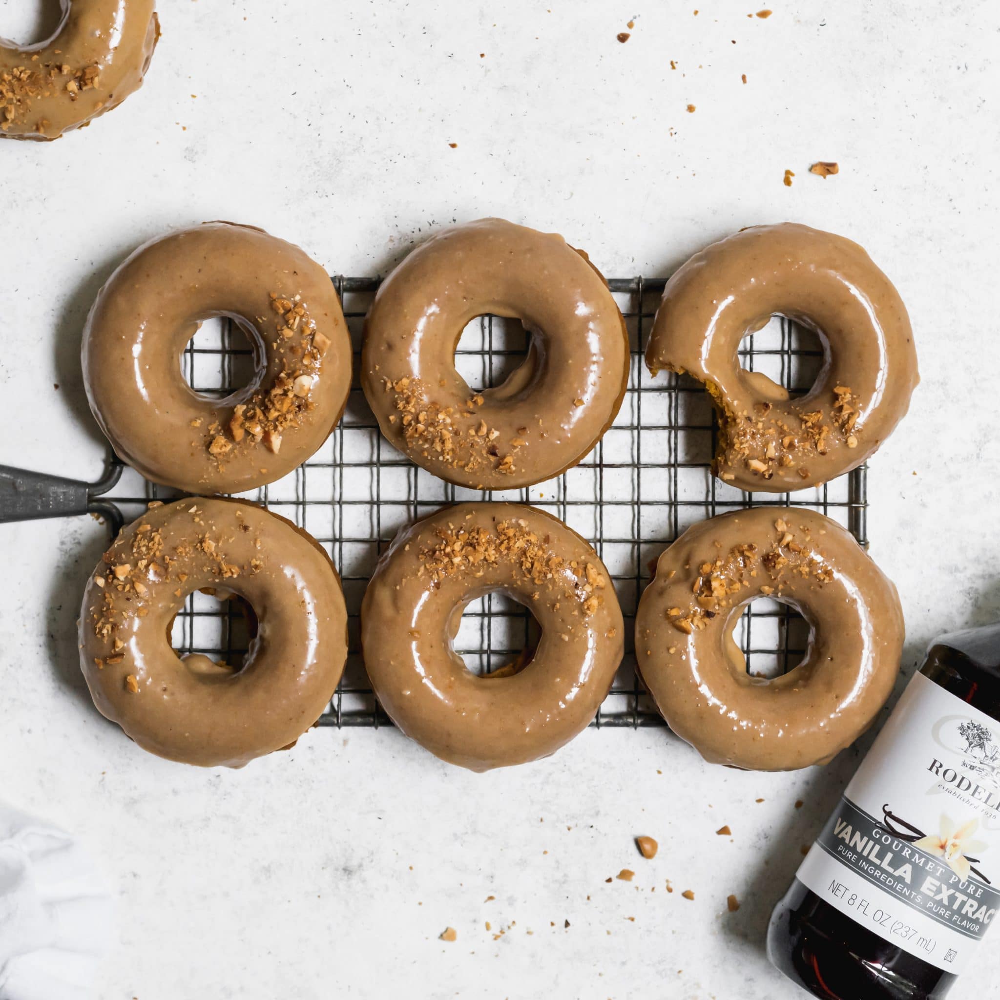 - When the donuts have cooled, dip into the glaze and place back onto the cooling rack. Sprinkle with chopped, toasted hazelnuts if desired. Store at room temperature in an airtight container up to 3 days.