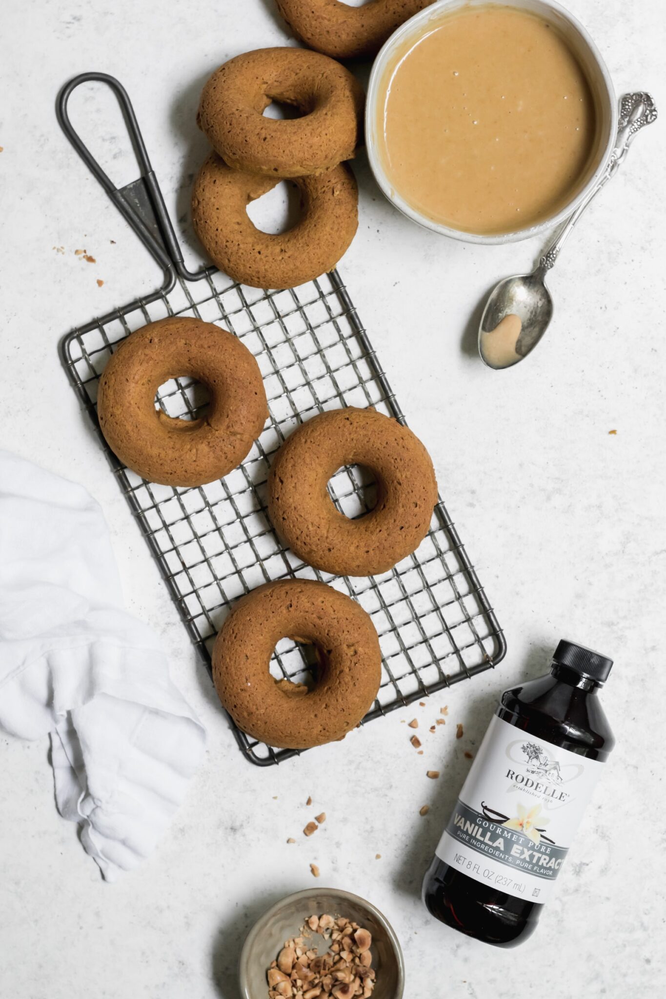 Pumpkin donuts made gluten free and grain free with Rodelle vanilla extract, dipped in a delicious maple glaze.