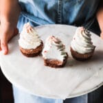 - Take the bowl out of the mixer and using a large spatula gently fold in the whipped cream, making sure it’s well blended throughout, but also making sure not to crush the air out of the whipped cream. The mixture will be thick. Take the crusts out of the freezer and divide the cheesecake filling evenly among the cupcake liners, pressing it to the bottom and smoothing the tops the best you can. Cover tightly with foil or plastic wrap and place in the fridge for a minimum of 4 hours, ideally overnight. Keep cheesecakes refrigerated until ready to serve.