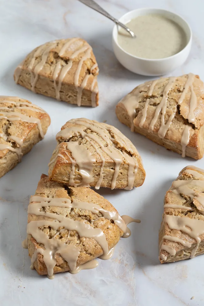 - Bake until golden brown and an instant-read thermometer inserted in center registers 200°F (93°C), 20 to 25 minutes, loosely covering with foil to prevent excess browning, if necessary. Let cool on pan for 5 minutes. Serve warm or at room temperature. Drizzle scones with Coffee Glaze, and serve with Vanilla Sweetened Condensed Milk.