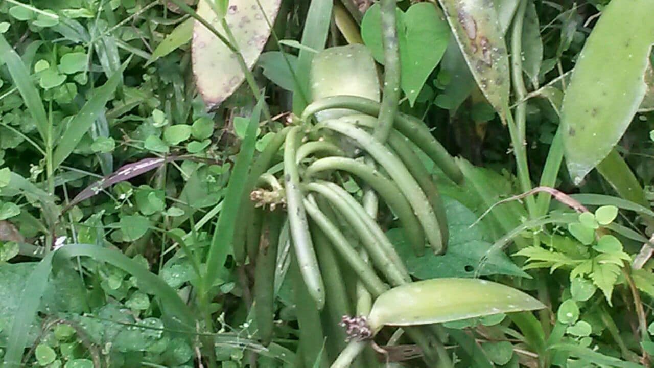 - Green vanilla beans on the vine